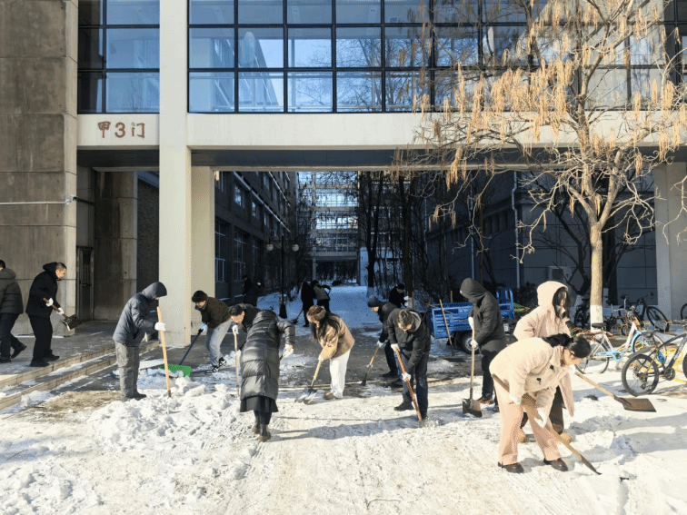 尽管户外寒风凛冽、气温极低,积雪覆盖厚实且部分路段已结冰,但丝毫没有阻挡师生们的劳动热情。大家分工协作、配合默契,有的挥舞铁锹破除冰层,有的手持扫帚清扫残雪,有的合力推送积雪至指定堆放点,现场呈现出一派热火朝天的劳动景象。经过数小时的辛勤奋战,学院责任区域内的主干道、台阶、楼宇出入口等关键部位的积雪和冰层被彻底清除,为留校师生开辟出了一条条安全畅通的“暖心通道”,圆满完成了“响应零延迟、除雪无死角、安全有保障”的工作要求。